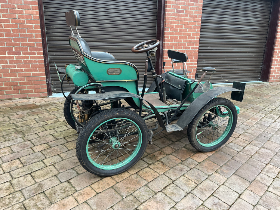 It has an air-cooled Di Dion Bouton 2 1/4hp engine, with Di Dion Bouton being one of the largest engine manufacturers at the time. It’s a 4-stroke engine with push rods on the outside and atmospheric valve for inlet.
