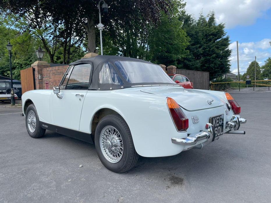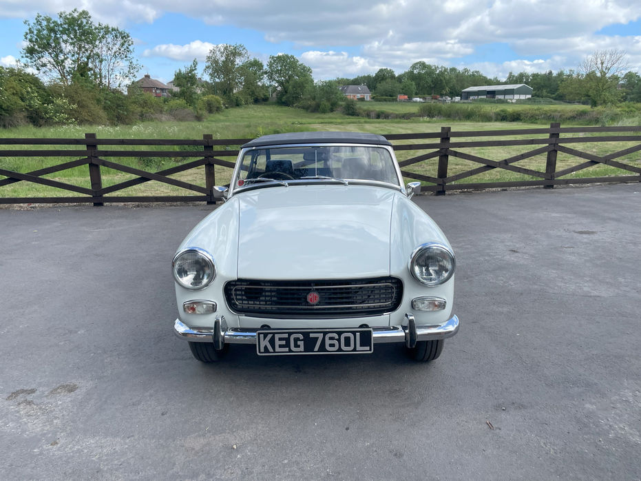 1973 MG Midget for sale, it has a nice little 1275cc engine with round wheel arches and chrome bumper. This is the second time this car has been in our collection and it's a fantastic little car. In it’s restoration it had a full professional re-spray in two-pack Glacier White. It had it’s brakes, front and rear suspension, steering, battery and tyres replaced. The gearbox was also re-conditioned in 2021.