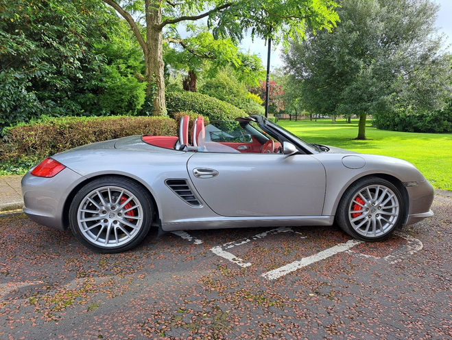 6 speed manual transmission with only just over 41000 miles on the clock. Finished in GT Silver with full red extended leather interior and red hood. Built 16th July 2008 and first registered September 2008 (58 registration). Condition wise, it's in incredible order inside and out and genuinely one of the best RS60's on the market, a real credit to its former owners who have taken great care of it. It's such a beautiful car to drive, sounding absolutely glorious, breathing through its standard fit active Porsche sports exhaust, the car has fantastic analogue steering and feels every bit the special sports car. It has no oil leaks or faults and has been very well maintained and with all receipts available. 19″ alloy wheels with Michelin N rated tyres fitted all round and 5mm spacers front and rear. Front discs replaced Aug 2023. Red leather sports seats with GT silver hard shell backs GT Silver seat belts, red hood, automatic controlled air conditioning, Porsche CDR 24 cd and radio. detailed service history complete, with Aug 2023 MOT original service book / service pack, two keys, A really incredibly clean and well looked after Boxster RS60 Spyder.