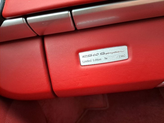 Enhanced starter motor, Battery disconnection switch, Brake pad wear sensors front and rear, Electric engine and trunk lid release, Multi-function display, On board computer, Outside temperature gauge, Porsche Active Suspension Management (PASM), Porsche stability management (PSM), 2 speed front wipers + intermittent wipe, Aspherical driver's exterior mirror, Automatically extending rear spoiler, Body colour bumpers, Body colour door handles, Body colour electric/heated door mirrors, Brushed stainless steel twin exhaust pipes, Coming home function, Electric heated rear glass window, Electric windows one touch open/close, Electrical soft-top actuation with comfort window lowering + closing of side windows, Front air dam with integrated air inlets, Front fog lights, Front lip spoiler, Green tinted glass, Heated washer nozzles, Metallic paint, Sports exhaust system, Stainless steel door entry guards marked RS 60 Spyder, Under-carriage cover, Water repellent side windows, 3 spoke 20” RS Spyder design red leather sports steering wheel, Porsche fitted wind deflector behind seats, Active carbon filter, Aluminium gear lever, Carrera red carpet, Carrera red floor mats, Coat hook integrated into back seat, Driver/passenger manual seat height adjustment, Driver/passenger seats fore/aft adjustment, , Electrically adjustable backrest, Footwell illumination, Front centre console storage box, Front headrests, Front passenger seat ISOFIX location point, Gt silver metallic finish on seats/rear section of centre console, Height/reach adjust steering wheel, Integrated double cupholders, Interior orientation lighting, Interior roof lining, Leather covered handbrake/gear-lever/door pulls, Leather dashboard, Leather door panels, Natural Leather interior, Lockable glovebox, Luggage compartment lid front and rear in aluminium, Rear centre console + storage compartment, Sports pedals, Storage compartments in doors, 3 point automatic seatbelts, ABS, Driver and passenger airbags, Front seatbelt pretensioners + load limiters, Head airbags, Motor Slip Regulation (MSR) - Engine Drag Torque Control, Passenger airbag deactivate switch, Rollover bar in exterior colour, Seatbelts in silver grey, Side (thorax) airbags, Alarm, Locking wheel bolts, Remote control central locking, Transponder engine immobiliser, Tilt sensor, Theft security system, Aluminium look instrument dials, Interior trim in aluminium look paint finish, 19 Sport Design alloy wheels, Tyre repair kit, including sealant foam.